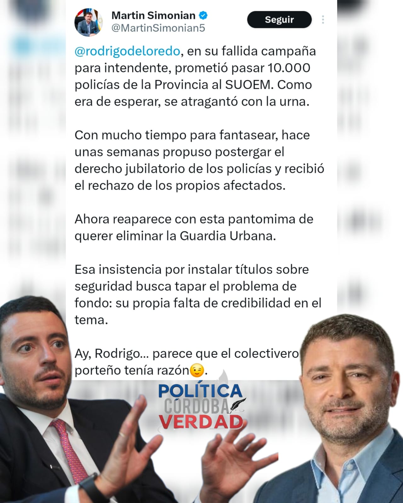 Como era de esperar, la propuesta y declaraciones de De Loredo en relación a la guardia urbana ya están dejando un tendal de respuestas por parte del oficialismo en la ciudad. En su red social X, el presidente de la bancada de Hacemos Unidos por Córdoba, Martín Simonian, chicaneó al radical y dijo que «se atragantó con la urna».
