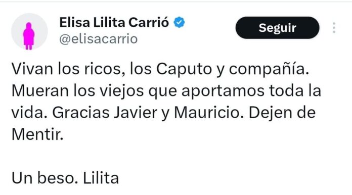 “Gracias Javier y Mauricio. Dejen de Mentir. Un beso. Lilita”, cerró Carrió con sarcasmo al referirse a Milei y Macri.