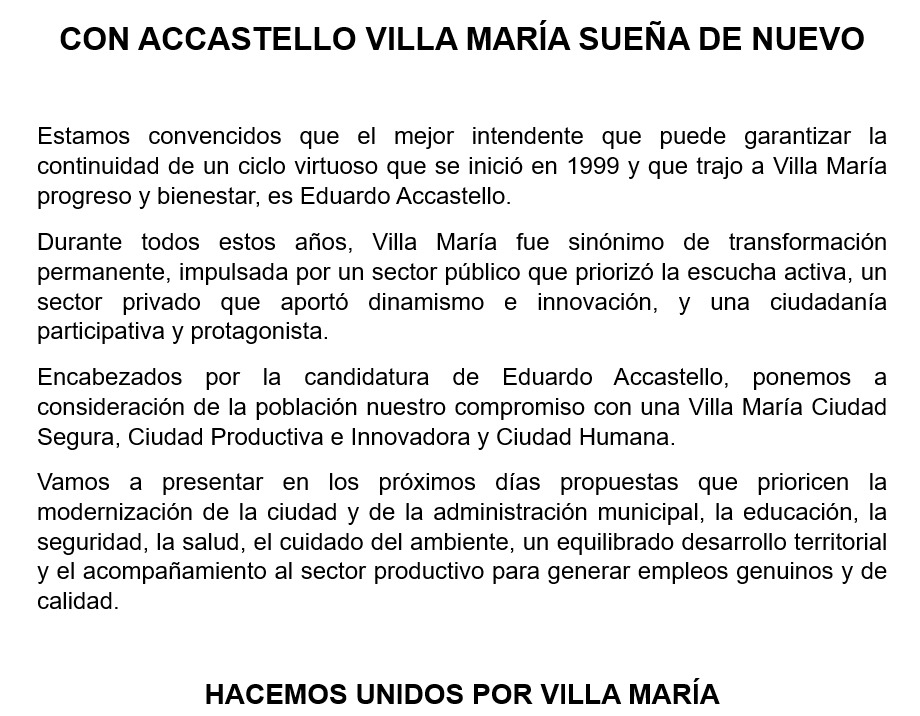 El documento adelanta también que en los próximos días se presentarán las propuestas en las distintas áreas en las que la propuesta Hacemos Unidos por Villa María enfocará su trabajo en la próxima gestión.