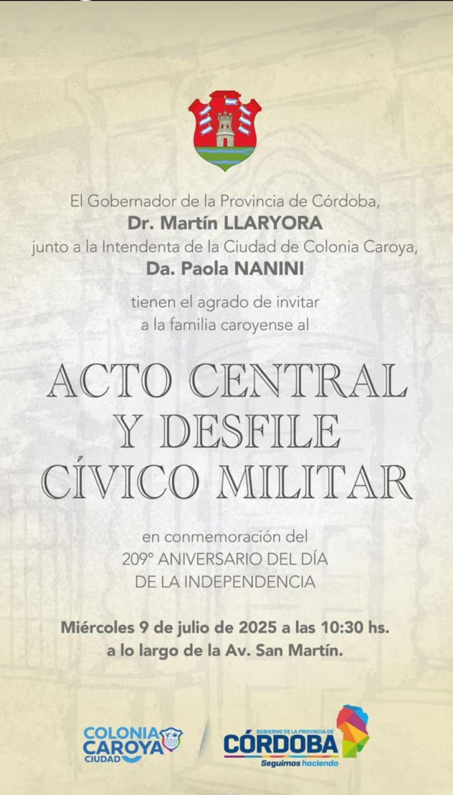 El gobernador Martin Llaryora aceptó la invitación de la intendente Paola Nanini por lo que los actos conmemorativos y el desfile cívico militar de la provincia se lleva a cabo en Colonia Caroya.