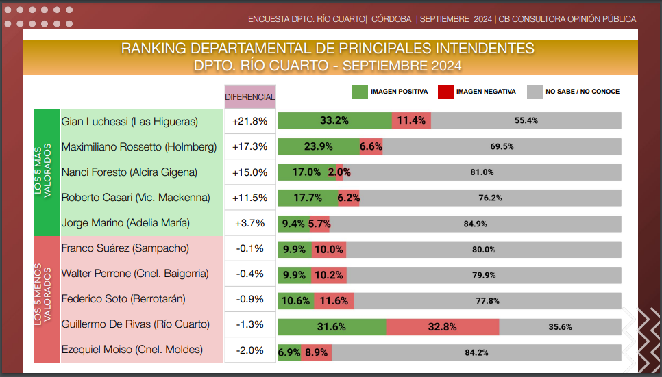 La encuesta indicó que los tres Intendentes con mejor diferencial de imagen positiva en el Departamento son: Gian Luchessi de Las Higueras con +21.8% de saldo positivo, en segundo lugar quedó Maximiliano Rossetto de Santa Catalina Holmberg con +17.3%, y cerró este podio Nancy Foresto de Alcira Gigena con +15%.