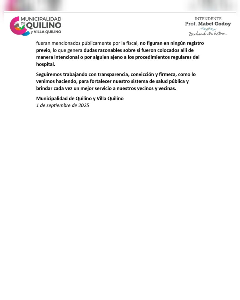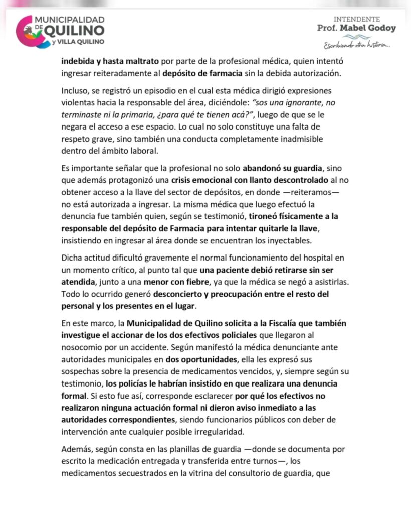 Tras esta situación, la Municipalidad emitió un durísimo comunicado con fuertes críticas a la fiscalía de Dean Funes que lo llevó adelante y contra una médica del nosocomio, que habría sido la responsable de colocar medicamentos vencidos para generar la situación en cuestión.
