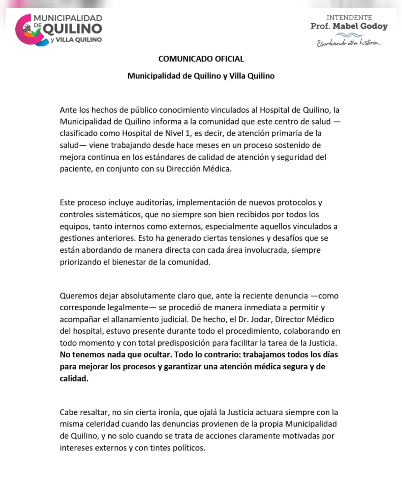 Tras esta situación, la Municipalidad emitió un durísimo comunicado con fuertes críticas a la fiscalía de Dean Funes que lo llevó adelante y contra una médica del nosocomio, que habría sido la responsable de colocar medicamentos vencidos para generar la situación en cuestión.