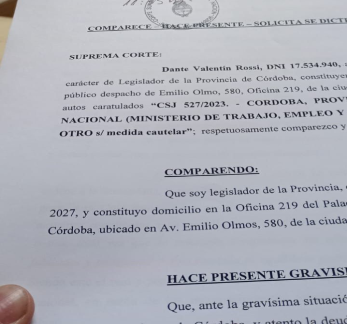 “La Nación está obligada a cumplir. En defensa de todos los cordobeses, pedimos que la Corte ordene de inmediato el cumplimiento de sus obligaciones”, enfatizó Rossi.