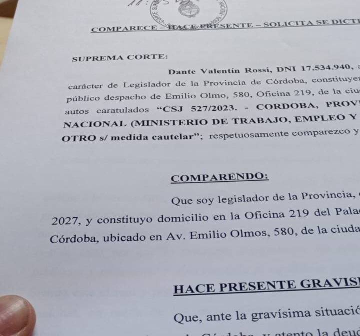 «Ante la gravísima situación económica y financiera que aqueja a la Caja de Jubilaciones de Córdoba, y atento la deuda que la Nación posee con la Provincia de Córdoba, en razón de estos autos y de otro similar, articulado ante Vuestro Tribunal, es que comparezco a los fines de solicitarles provean al dictado de resolución de manera urgente, encontrándose severamente afectados los haberes de los jubilados y pensionados de la Provincia» comienza diciendo Rossi en el escrito presentado ante la Corte.