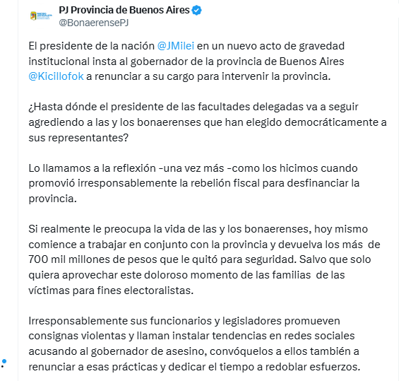 “El presidente de la nación Javier Milei en un nuevo acto de gravedad institucional insta al gobernador de la provincia de Buenos Aires Axel Kicillof a renunciar a su cargo para intervenir la provincia», afirmaron, y se preguntaron: “¿Hasta dónde el presidente de las facultades delegadas va a seguir agrediendo a las y los bonaerenses que han elegido democráticamente a sus representantes?”.