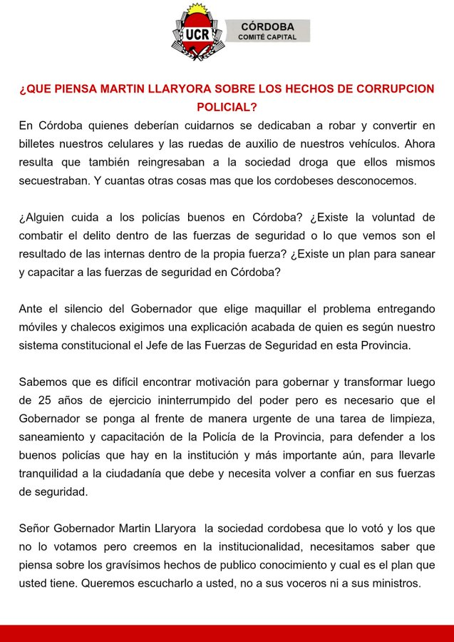 Apenas asumidas las nuevas autoridades del Comité Capital de la Unión Cívica Radical de la ciudad de Córdoba, la UCR Córdoba Capital emitió un duro documento contra el gobernador Martín Llaryora que lleva como título: «¿Qué piensa Llaryora de la corrupción policial?».