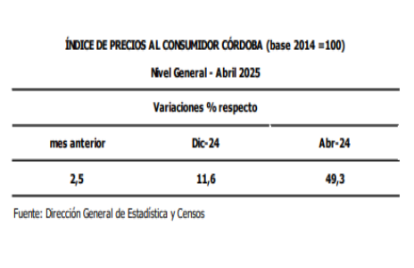 En el mes de abril de 2025, el Índice de Precios al Consumidor Córdoba (IPCCba) registró un incremento en su nivel general de 2,5% respecto al mes anterior.