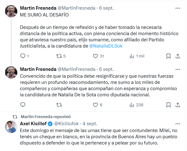 Luego de esa larga trayectoria como dirigente elegido por la ex presidenta, Fresneda desapareció de la esfera política, para volver a aparecer en esta campaña para Diputados donde, para sorpresa de todos, se manifestó en apoyo a Natalia De la Sota en un largo texto que publicó en redes sociales: «Después de un tiempo de reflexión y de haber tomado la necesaria distancia de la política activa, con plena conciencia del momento histórico que atraviesa nuestro país, elijo sumarme, como afiliado del Partido Justicialista, a la candidatura de Natalia De La Sota», dice en su texto.