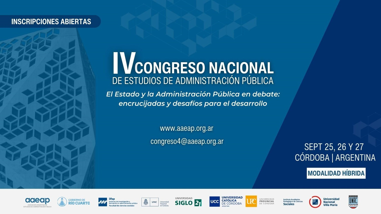 El IV Congreso Nacional de Estudios de Administración Pública de la AAEAP, organizado junto a la Facultad de Ciencia Política y Relaciones Internacionales de la Universidad Católica de Córdoba; el Instituto de Investigación y Formación en Administración Pública de la Universidad Nacional de Córdoba; la Universidad Siglo21; la Universidad Provincial de Córdoba; el Instituto Académico Pedagógico en Ciencias Sociales de la Universidad Nacional de Villa María; el Departamento de Ciencias Jurídicas, Políticas y Sociales- Facultad de Ciencias Humanas de la Universidad Nacional de Río Cuarto y el Gobierno de la Ciudad de Río Cuarto, manifiestan el compromiso de impulsar un ámbito en el cual, con pluralidad y rigor profesional, se presenten investigaciones y experiencias de gestión realizadas recientemente en una diversidad de instituciones dedicadas a los asuntos públicos.