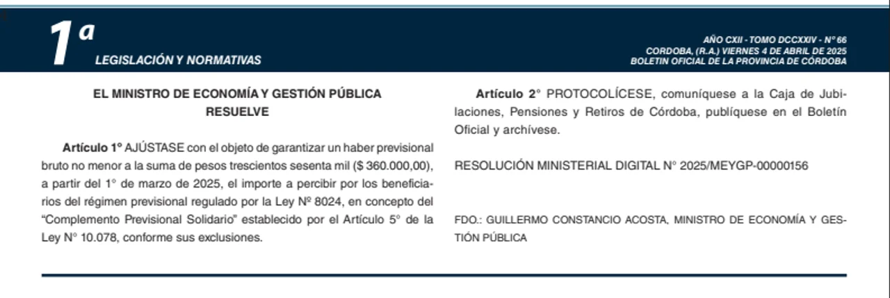 Desde el Ministerio de Economía y Gestión Pública de Córdoba, este viernes se emitió una nueva resolución destinada a las “jubilaciones mínimas” de la Caja provincial.
