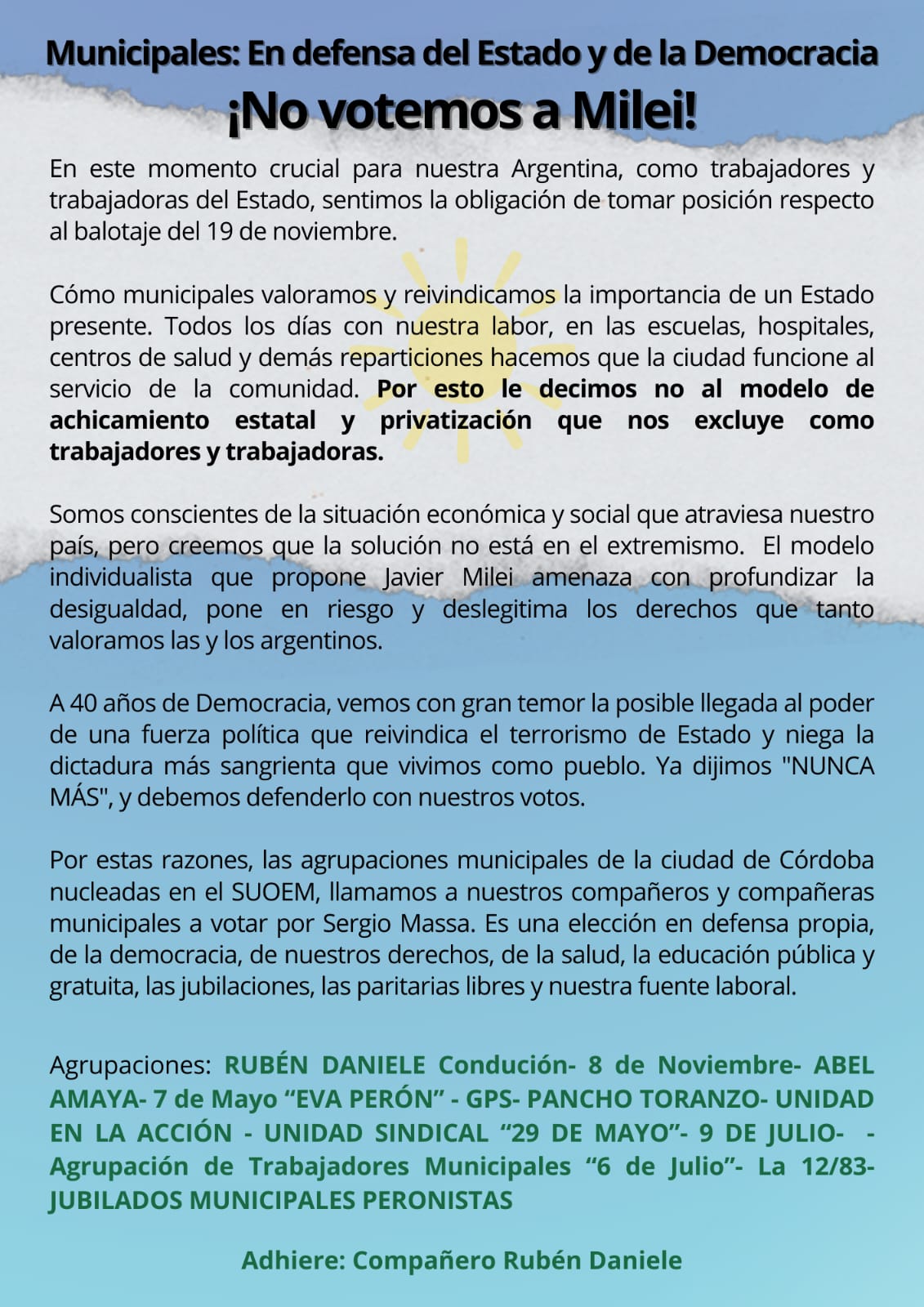 «Las agrupaciones municipales de la ciudad de Córdoba nucleadas en el SUOEM, llamamos a nuestros compañeros y compañeras municipales a votar por Sergio Massa. Es una elección en defensa propia, de la democracia, de nuestros derechos, de la salud, la educación pública y gratuita, las jubilaciones, las paritarias libres y nuestra fuente laboral» concluye, contundente, el mensaje de los municipales cordobeses que lleva las firmas de las agrupaciones: RUBÉN DANIELE Condución- 8 de Noviembre- ABEL AMAYA- 7 de Mayo «EVA PERÓN» – GPS- PANCHO TORANZO- UNIDAD EN LA ACCIÓN – UNIDAD SINDICAL «29 DE MAYO»- 9 DE JULIO- – Agrupación de Trabajadores Municipales «6 de Julio». La 12/83- JUBILADOS MUNICIPALES PERONISTAS, y también la adhesión personal de Rubén Daniele.
