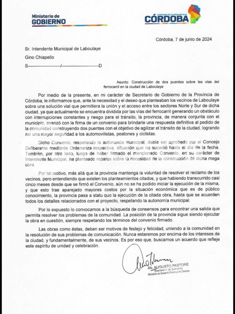 El Gobierno de la Provincia de Córdoba salió al cruce de la reciente postura que adoptó la Municipalidad de Laboulaye acerca de la obra de los puentes sobre las vías del ferrocarril, tras conocer los resultados del estudio efectuado mediante la Facultad de Arquitectura, Urbanismo y Diseño de la Universidad Nacional de Córdoba y encargado por el intendente Gino Chiapello.