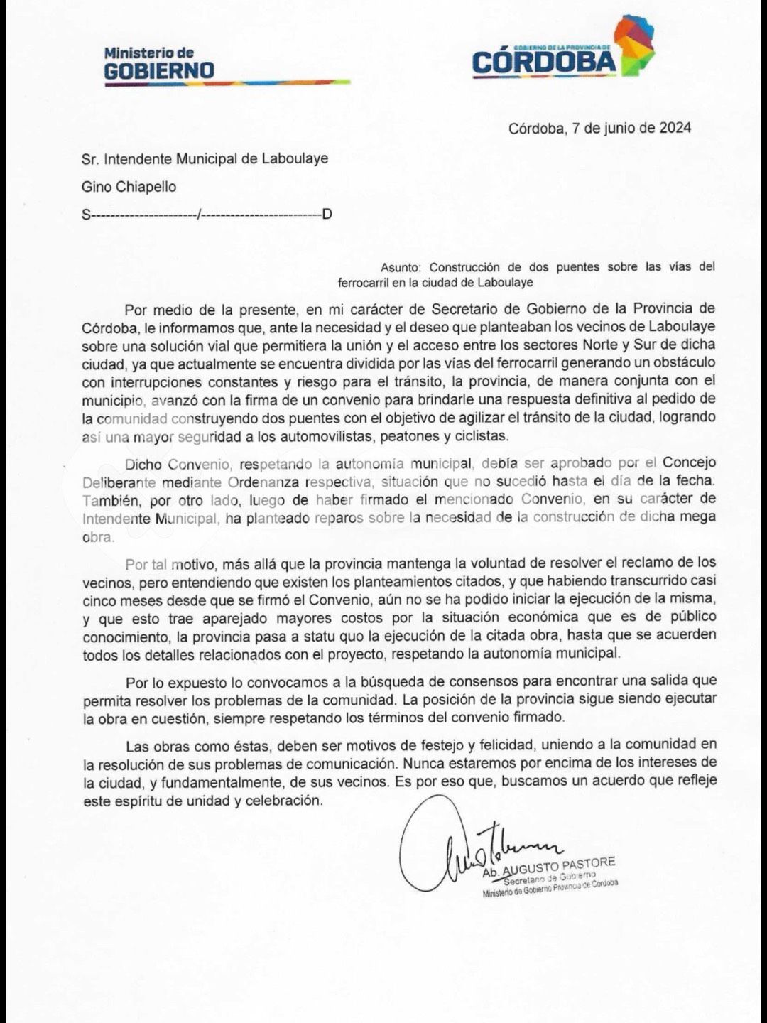 En el texto, Pastore reseña la firma del convenio entre las jurisdicciones, acuerdo que, para avanzar hacia la ejecución, “debía ser aprobado por el Concejo Deliberante mediante Ordenanza respectiva, situación que no sucedió hasta el día de la fecha”.