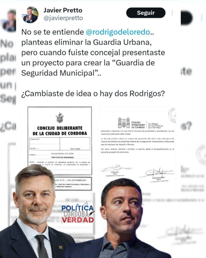 En respuesta a los dichos del ex diputado, Javier Pretto compartió en su cuenta de X una publicación donde enseñó documentos del Concejo Deliberante en los que se puede apreciar como Rodrigo De Loredo propuso la creación, cuando era concejal, de la «Guardia de Seguridad Municipal”. A dicha publicación, el actual viceintendente, la cerró con una irónica chicana: «¿Cambiaste de idea o hay dos Rodrigos?»