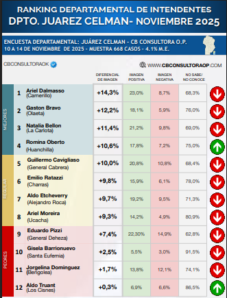 Los intendentes del dpto. Juárez Celman con mejor diferencial de imagen en este mes son: Ariel Dalmasso de Carnerillo (+14,3%) en primer lugar, seguido por Gastón Bravo de Olaeta (+12,2%), y en tercer lugar Natalia Bellón de La Carlota (+11,4%).