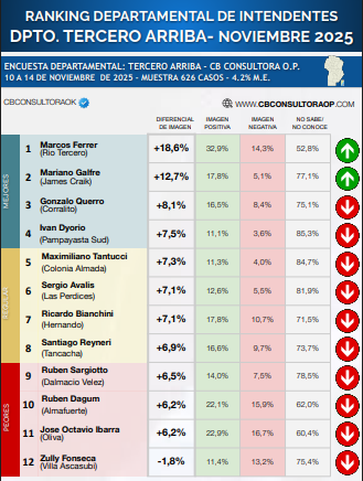 Los intendentes del dpto. Tercero Arriba con mejor diferencial de imagen en este mes son: Marcos Ferrer de Río Tercero (+18,6%) en primer lugar, seguido por Mariano Galfré de James Craik (+12,7%), y en tercer lugar Gonzalo Querro de Corralito (+8,1%).