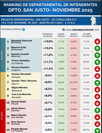 Los intendentes del dpto. San Justo con mejor diferencial de imagen en este mes son: Sebastián Demarchi de Morteros (+12,9%) en primer lugar, seguido por Mauricio Actis de Brinkmann (+12,4%), y en tercer lugar Gerardo Cicarelli de Miramar (+11,8%).