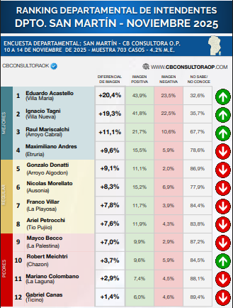 Los intendentes del dpto. San Martín con mejor diferencial de imagen en este mes son: Eduardo Accastello de Villa María (+20,4%) en primer lugar, seguido por Ignacio Tagni de Villa Nueva (+19,3%), y en tercer lugar Raúl Mariscalchi de Arroyo Cabral (+11,1%).