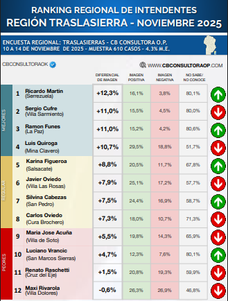 Los intendentes de la Región Traslasierra con mejor diferencial de imagen en este mes son: Ricardo Martín de Serrezuela (+12,3%) en primer lugar, seguido por Sergio Cufré de Villa Sarmiento (+11,0%), y en tercer lugar Ramón Funes de La Paz (+11,0%).