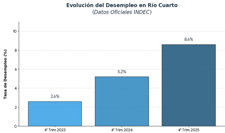 El mercado laboral cerró el 2025 con un marcado deterioro. De acuerdo a los datos que publicó ayer el Indec, en el caso de Río Cuarto la desocupación alcanzó el 8,6% y se acercó rápidamente a los dos dígitos, cuando en el mismo período de 2024 había arrojado un 5,2% y un año antes era de apenas el 2,8%; siempre según las cifras oficiales.