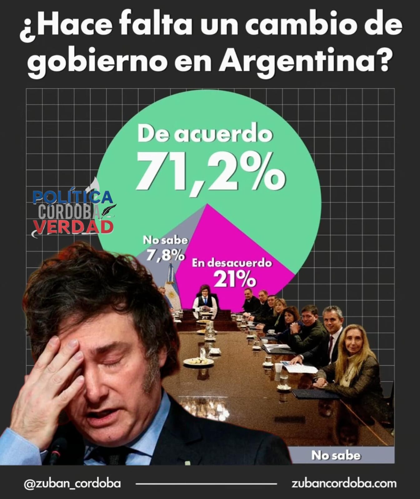 En medio del escándalo por el «Adorni Gate», un informe de Zuban Córdoba cayó como un balde agua helada en la Casa Rosada. Según la consultora, un 71,2% de argentinos pide un cambio de gobierno en el país. En el mismo informe tan sólo el 21% no estuvo de acuerdo con la pregunta: ¿Hace falta un cambio de gobierno en la Argentina?