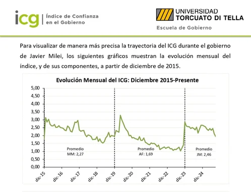 El Índice de Confianza en el Gobierno (ICG) elaborado por la Universidad Torcuato Di Tella se ubicó en 1,94 puntos en septiembre, lo que implicó una caída mensual del 8,2% y del 10% interanual, alcanzando el nivel más bajo desde que Javier Milei asumió la presidencia.