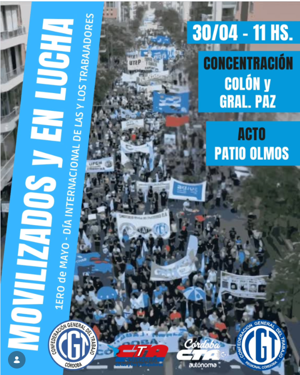 Bajo la consigna de visibilizar reclamos salariales y en la antesala del feriado por el Día del Trabajador, diversas organizaciones gremiales confirmaron una jornada de protesta con movilización que inicia a las 11 de la mañana en Colón y General Paz y se traslada hacia el Patio Olmos donde se realizará un acto central.