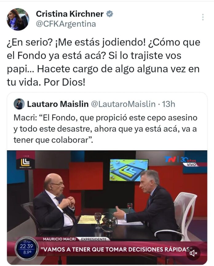 En en ese mismo sentido se expresó Cristina Fernández de Kirchner, que utilizó la red social twitter para abordar el tema: «¿En serio? ¡Me estás jodiendo! ¿Cómo que el Fondo ya está acá? Si lo trajiste vos papi… Hacete cargo de algo alguna vez en tu vida. Por Dios!»