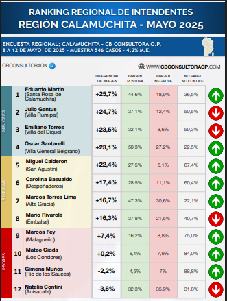 Los tres intendentes de la Región Sierras (Calamuchita y Santa María) con mejor diferencial de imagen en este mes son: Eduardo Martín de Santa Rosa de Calamuchita (+25,7%) en primer lugar, seguido por Julio Gantus de Villa Rumipal (+24,7%), y en tercer lugar Emiliano Torres de Villa del Dique (+23,5%).