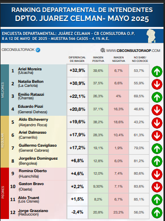 Realizado con el método de recolección de Información CB CAWI Research (Online), a través de un Cuestionario estructurado de preguntas cerradas con aplicación directa en una Muestra por Departamentos de 7601 casos recolectados entre el 8 y el 12 de Mayo de 2025, CB Consultora dio a conocer el nuevo estudio sobre la imagen de Intendentes de la provincia de Córdoba, vale mencionar que el único Intendente que no es medido para la presente investigación es Daniel Passerini, porque la ciudad Capital es un único departamento y no hay comparación entre pares.