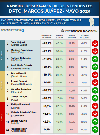 Los tres intendentes del Dpto. Marcos Juárez con mejor diferencial de imagen en este mes son: Sara Majorel de Marcos Juarez (+25,1%) en primer lugar, seguido por Mariano Calamante de Monte Buey (+22,1%), y en tercer lugar Patricia Delsoglio de Isla Verde (+21,8%).