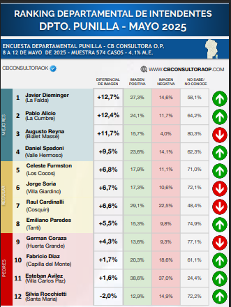 Los tres intendentes del Dpto. Punilla con mejor diferencial de imagen en este mes son: Javier Deminger de La Falda (+12,7%) en primer lugar, seguido por Pablo Alicio de La Cumbre (+12,4%), y en tercer lugar Augusto Reyna de Bialet Massé (+11,7%).