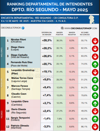 Los tres intendentes del Dpto. Río Segundo con mejor diferencial de imagen en este mes son: Nicolás Filoni de Oncativo (+28,3%) en primer lugar, seguido por Diego Viano de Luque (+28,2%), y en tercer lugar Diego Carballo de Villa del Rosario (+26,8%).