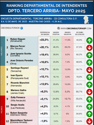 Los tres intendentes del Dpto. Tercero Arriba con mejor diferencial de imagen en este mes son: Rubén Dagum de Almafuerte (+23,3%) en primer lugar, seguido por Marcos Ferrer de Río Tercero (+20,1%), y en tercer lugar José Ignacio Scotto de Corralito (+19,4%).