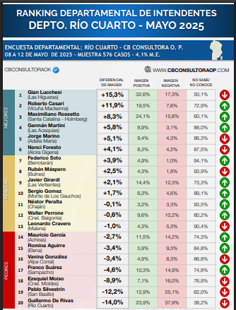 En el departamento Río Cuarto otra vez Guillermo De Rivas es el peor de todos, los tres intendentes con mejor diferencial de imagen en éste mes son: Gian Luchessi de Las Higueras (+15,3%) en primer lugar, seguido por Roberto Casari de V. Mackenna (+11,9%), y en tercer lugar Maximiliano Rossetto de Santa Catalina de Holmberg (+8,3%).