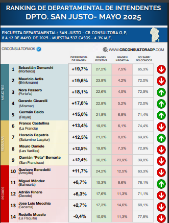 En el Dpto. San Justo los tres intendentes con mejor diferencial de imagen en este mes son: Sebastián Demarchi de Morteros (+19,7%) en primer lugar, seguido por Mauricio Actis (+19,6%), y en tercer lugar Nora Passero de Porteña (+18,1%).