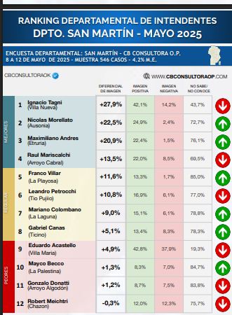 Los tres intendentes del Dpto. General San Martín con mejor diferencial de imagen en este mes son: Ignacio Tagni de Villa Nueva (+27,9%) en primer lugar, seguido por Nicolás Morellato de Ausonia (+22,5%), y en tercer lugar Maximiliano Andres de Etruria(+20,9%).